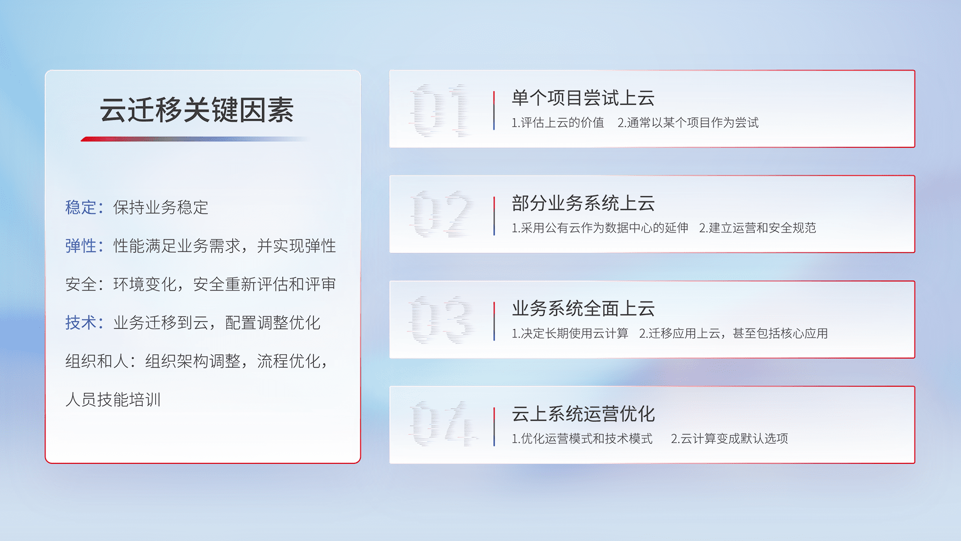 结合实际业务,,从规划设计、、云平台选型、、云原生改造、、、数据迁移、、、、集成交付,,,,迁移全过程为客户识别最佳上云路径,,,,做好风险识别管理,,设计网络架构、、、身份权限、、、安全审计合规、、、、操作审计、、、、日志审计、、监控告警策略、、、、多站点容灾设计等,,对云上基础设施进行整体规划,,提升IT治理水平,,,以满足弹性、、、高可用、、、高性能的需求。。。