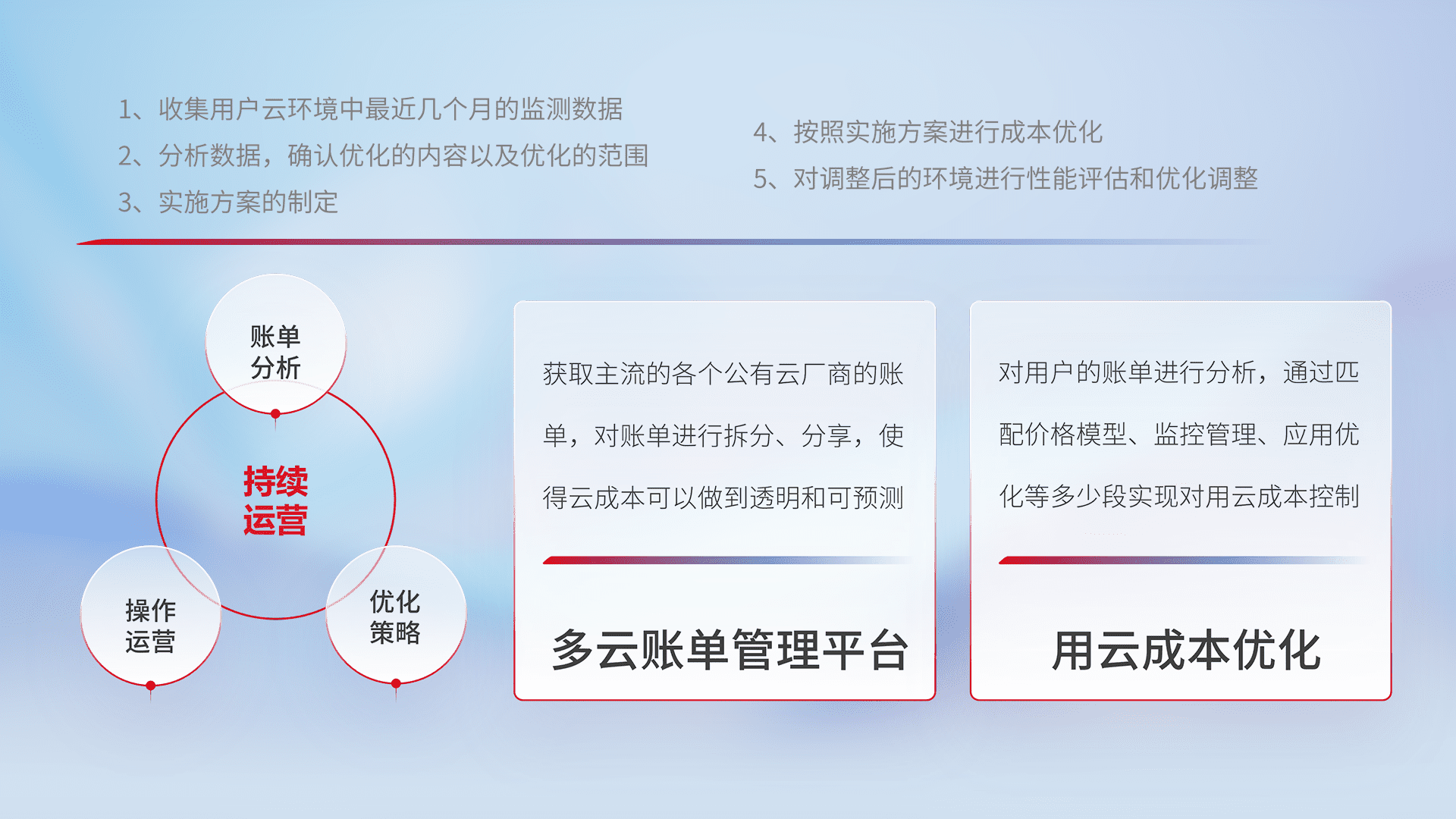 通过多云纳管,,,以统一的资源数据模型把客户的云资源进行抽象和封装,,,进而实现对多云资源的统一操作,,,保障云资源管理的可靠性、、稳定性与可用性。。量身定制化运维内容,,,,配置、、、开发运维、、、、补丁管理、、、备份、、、、监控、、、认证和访问管理、、审计和日常巡检等,,,保障在用云过程中的可靠度,,,稳定度以及高可用率。。。。